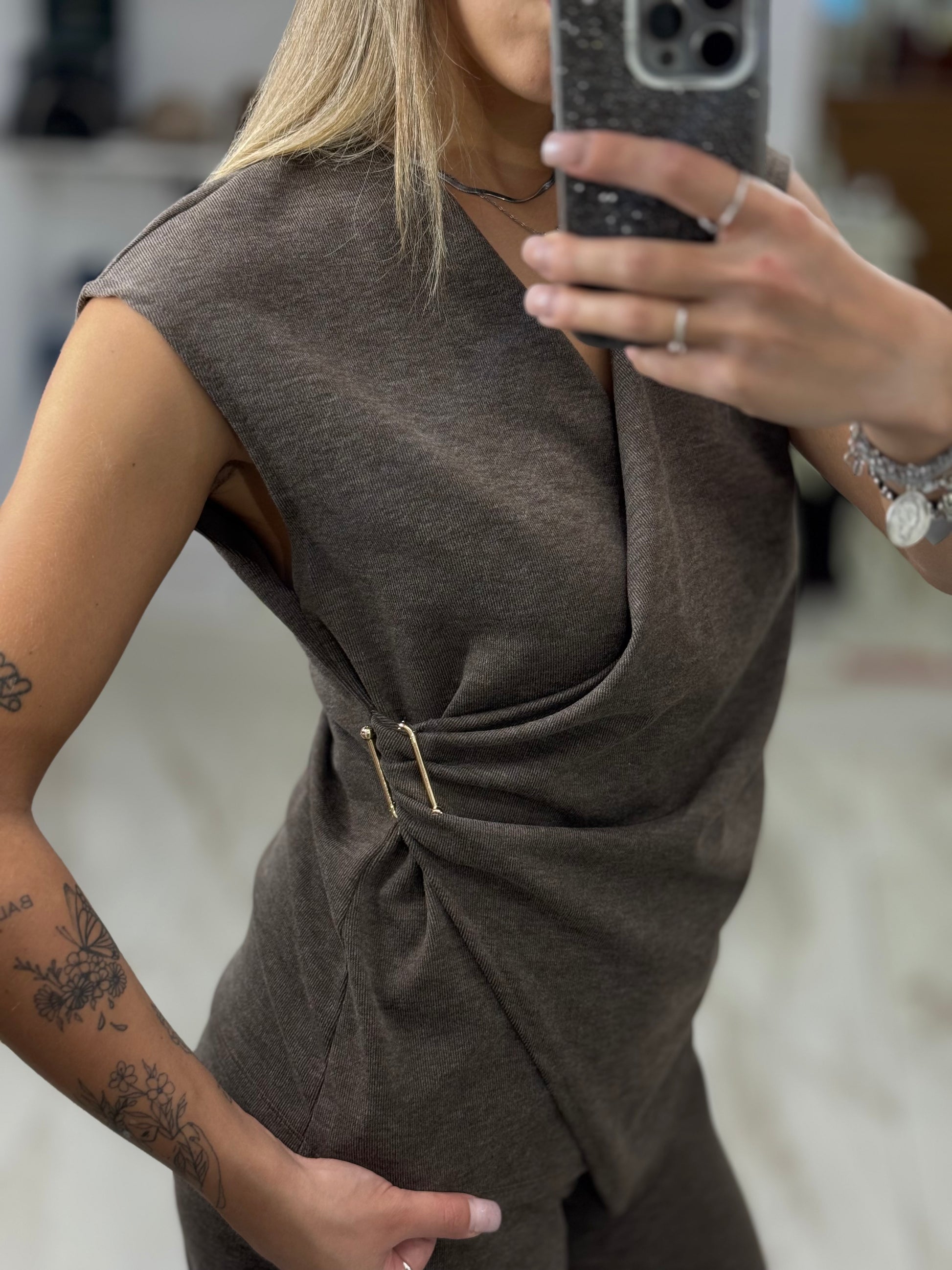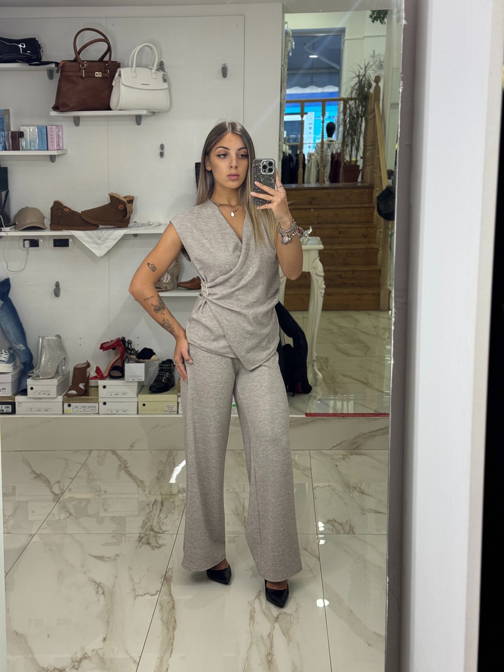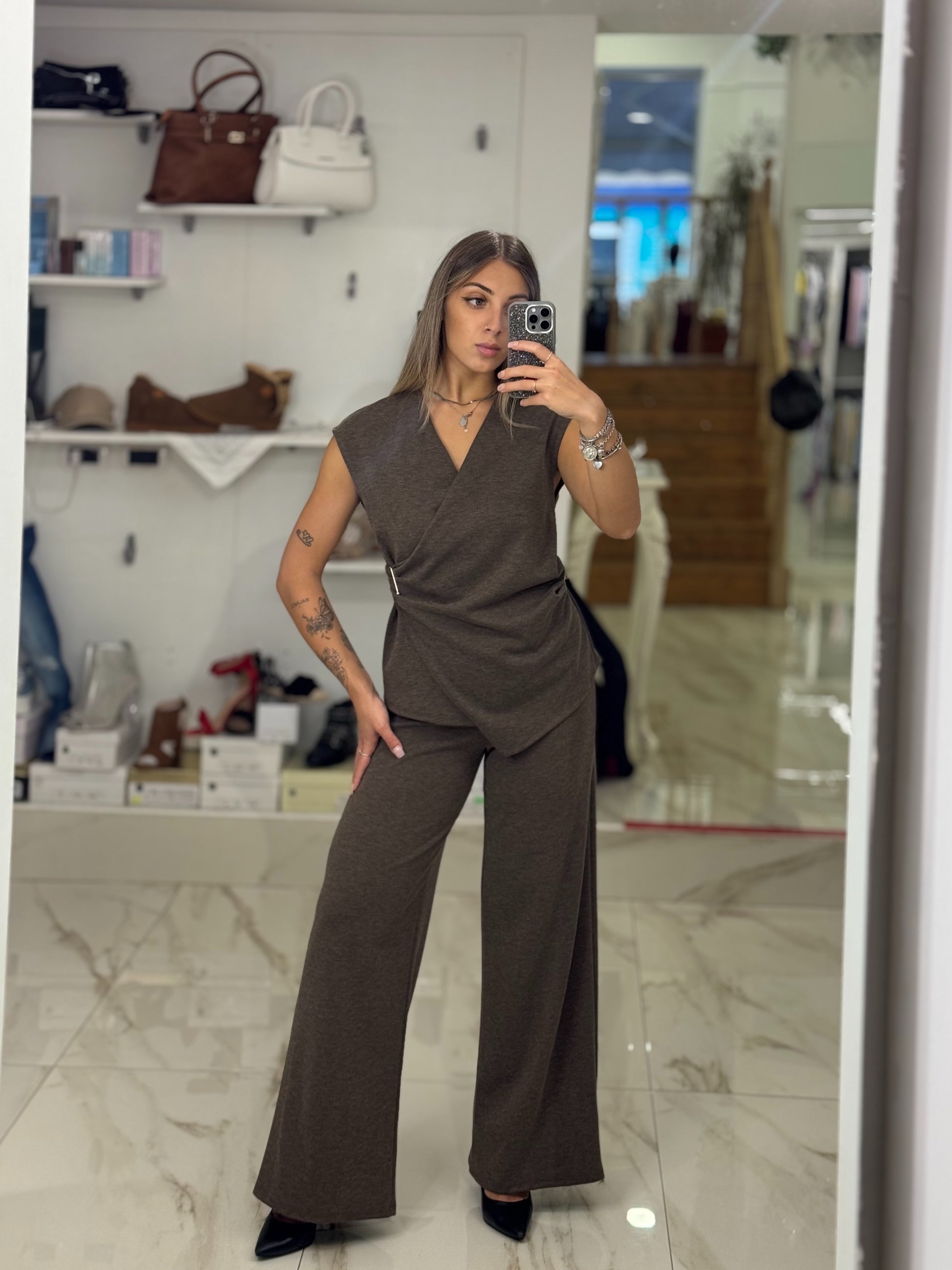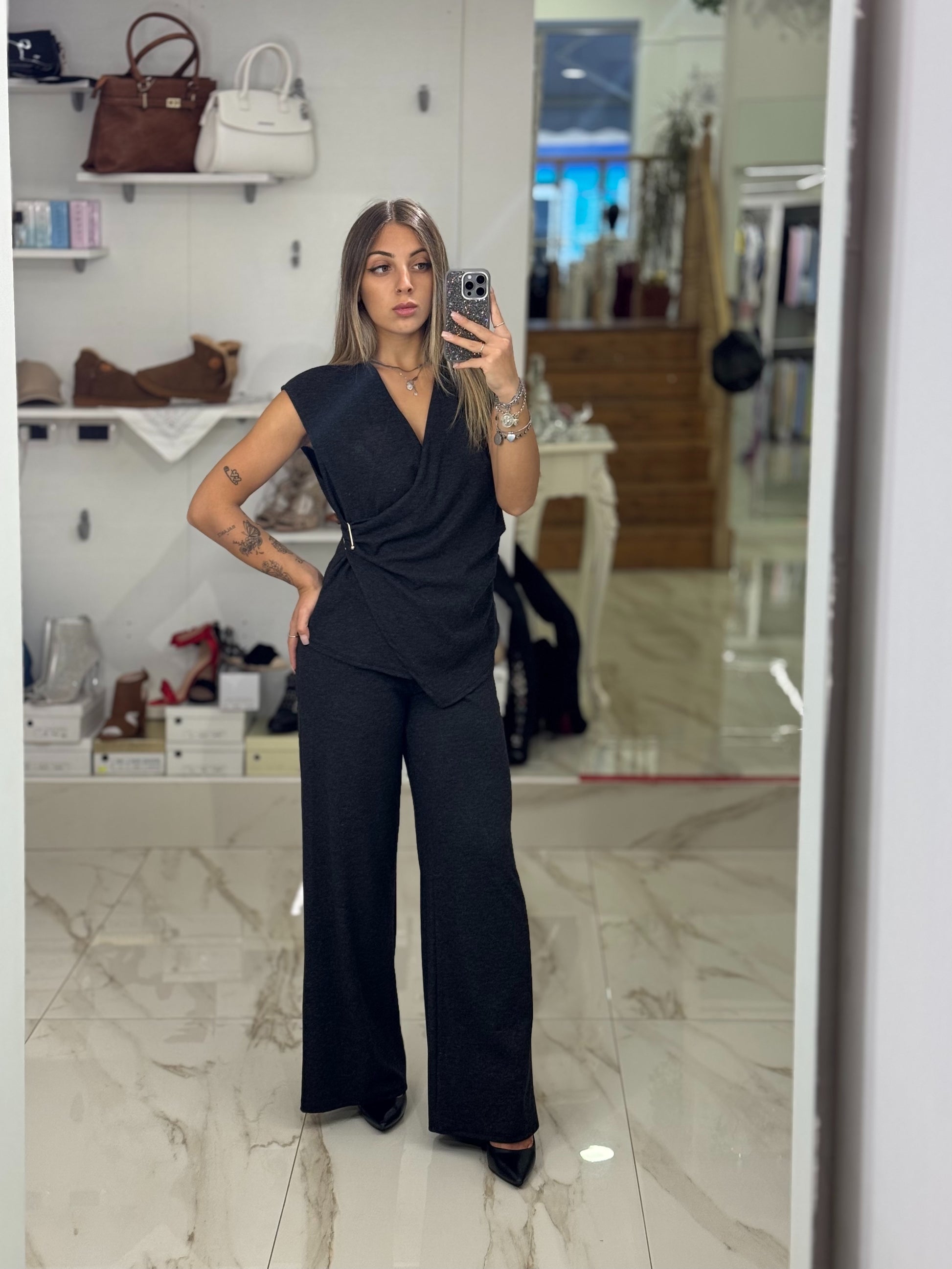 Completo in maglia, composto da top incrociato con dettaglio in vita e pantaloni palazzo a vita alta. Confortevole ma elegante, perfetto per look casual-chic.